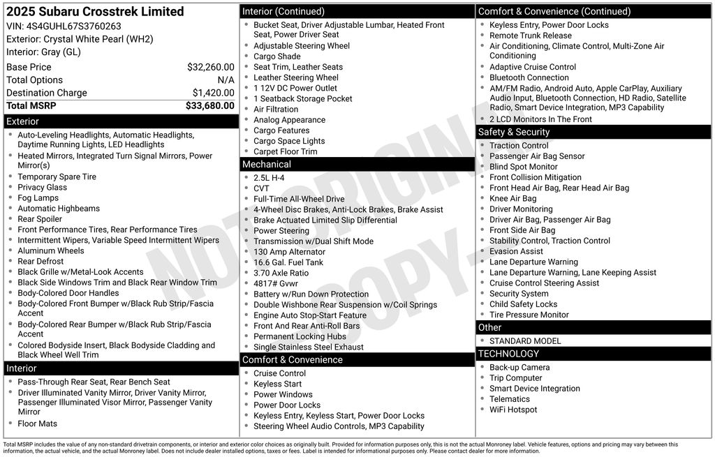 Subaru of Keene is proud to present you with another True Market Priced Pre-Owned Vehicle. Transparent Pricing Of $ 31995 !! This 2025 Subaru Crosstrek Limited Subaru Certified Pre-Owned is loaded with the following Factory Options: Standard Model, Subaru Certified Pre-Owned Certified, 4-Wheel Disc Brakes, 6 Speakers, ABS brakes, Air Conditioning, Alloy wheels, AM/FM radio: SiriusXM, Anti-whiplash front head restraints, Auto High-beam Headlights, Automatic temperature control, Brake assist, Bumpers: body-color, Crystal White Pearl Body Side Molding, Driver door bin, Driver vanity mirror, Dual front impact airbags, Dual front side impact airbags, Electronic Stability Control, Emergency communication system, Exterior Parking Camera Rear, Four wheel independent suspension, Front anti-roll bar, Front Bucket Seats, Front Center Armrest, Front dual zone A/C, Front fog lights, Front reading lights, Fully automatic headlights, Heated door mirrors, Heated Front Bucket Seats, Heated front seats, Illuminated entry, Knee airbag, Leather Shift Knob, Leather steering wheel, Leather-Trimmed Upholstery, LED Upgrade, Low tire pressure warning, Occupant sensing airbag, Outside temperature display, Overhead airbag, Overhead console, Panic alarm, Passenger door bin, Passenger vanity mirror, Power door mirrors, Power driver seat, Power steering, Power windows, Radio data system, Radio: Subaru 11.6" Multimedia Plus System, Rear anti-roll bar, Rear Gate Assist Handle, Rear Gate Light, Rear seat center armrest, Rear window defroster, Rear window wiper, Remote keyless entry, Security system, Speed control, Speed-sensing steering, Split folding rear seat, Spoiler, Steering wheel mounted audio controls, Tachometer, Telescoping steering wheel, Tilt steering wheel, Traction control, Trip computer, Turn signal indicator mirrors, Variably intermittent wipers, and Wheels: 18" x 7.0" J Machine Finish Aluminum-Alloy!!