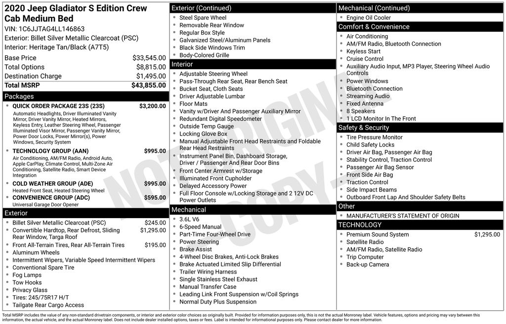 Certified. Clean CARFAX. 2020 Jeep Gladiator Sport 4WD 6-Speed Manual 3.6L V6 24V VVT