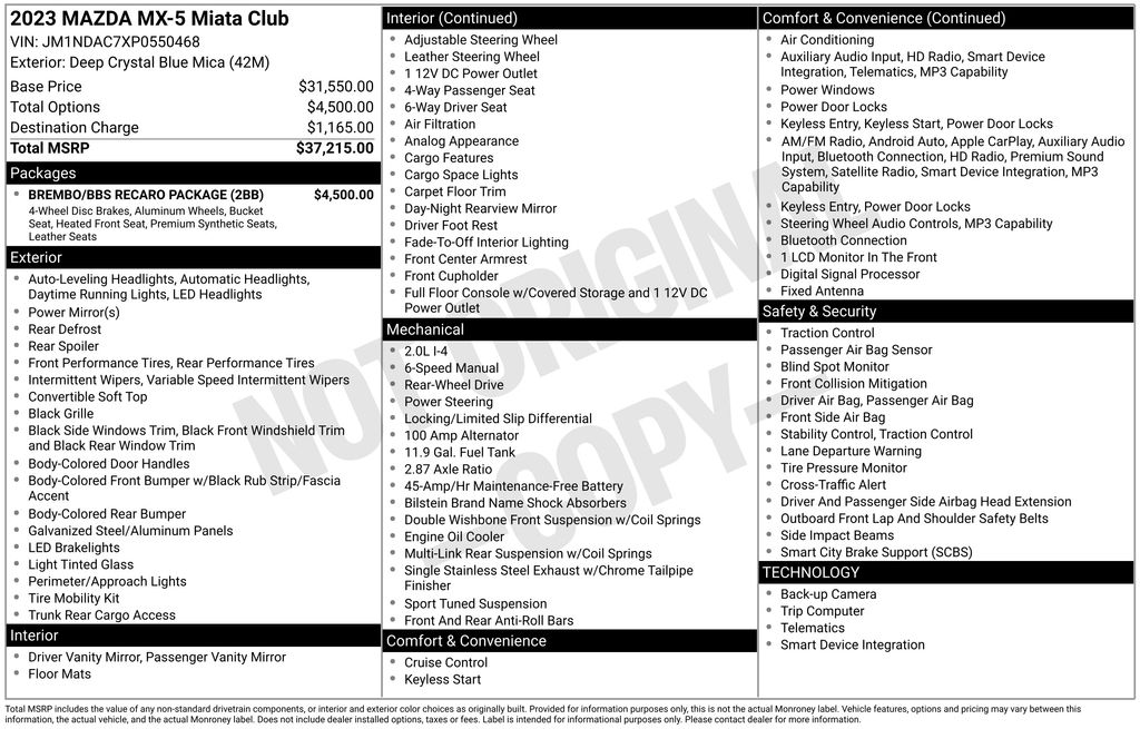 Certified. Deep Crystal Blue Mica 2023 Mazda MX-5 Miata Club 2D Convertible RWD 6-Speed Manual 2.0L 4-Cylinder DOHC 16V 26/34 City/Highway MPG