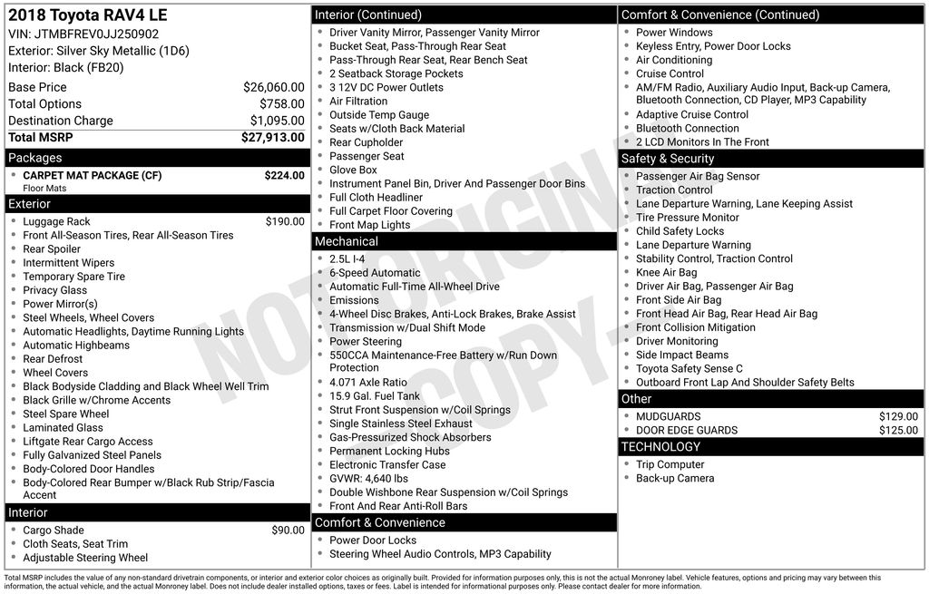 Silver Sky Metallic 2018 Toyota RAV4 LE 4D Sport Utility AWD 6-Speed Automatic 2.5L 4-Cylinder DOHC Dual VVT-i 22/28 City/Highway MPG