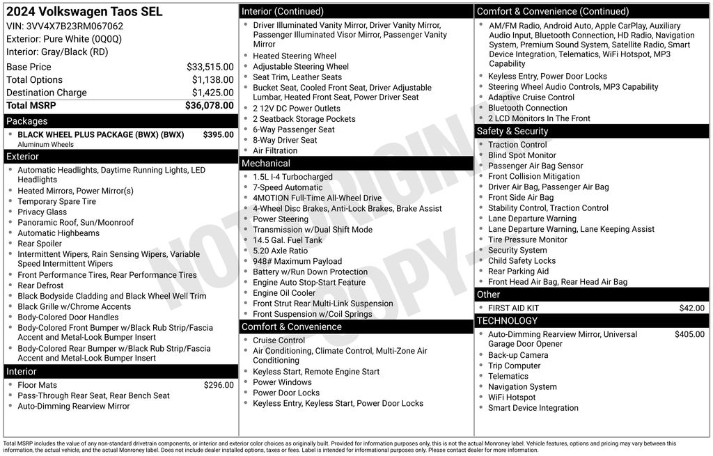 Certified. Clean CARFAX. 2024 Volkswagen Taos 1.5T SEL AWD 7-Speed DSG Automatic with Tiptronic 1.5L I4 Turbocharged DOHC 16V LEV3-SULEV30 158hp